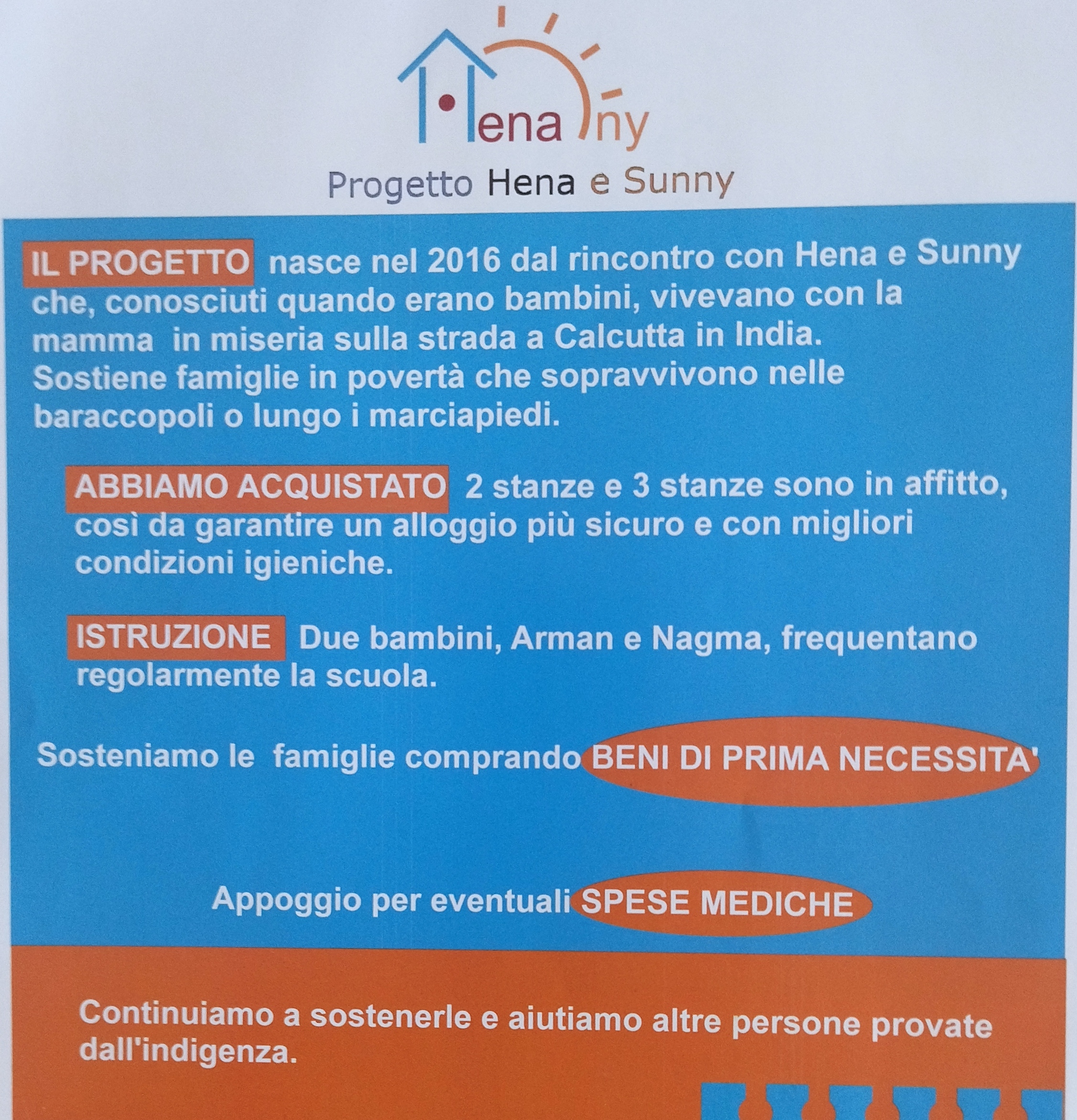 Il progetto Hena e Sunny aiuta famiglie povere ad uscire dalle Baraccopoli di Calcutta per vivere in stanze più sicure, pulite e dignitose. Ad oggi riesce a garantire regolare istruzione scolastica a due bambini, compriamo beni di prima necessità e aiutiamo le famiglie per eventuali spese mediche.